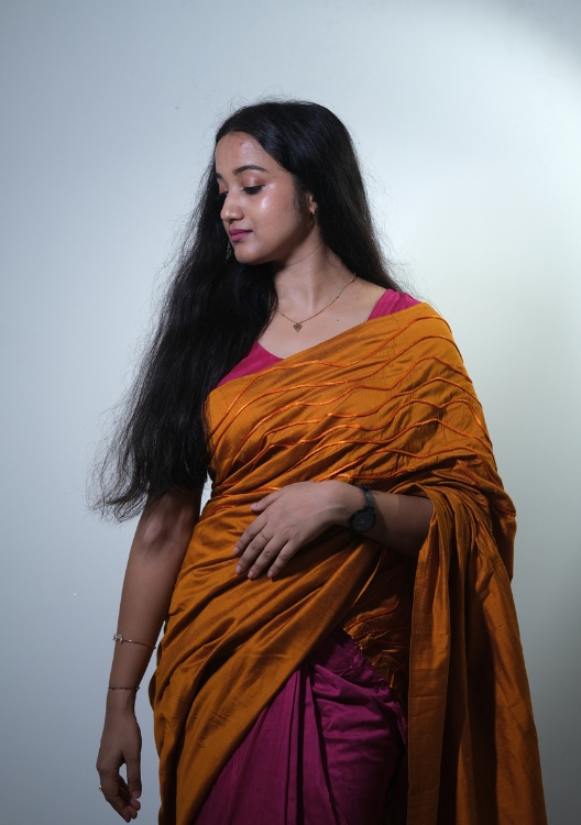 | Color | Deep Magenta Body, Mustard Pallu, Magenta Net Pallu |