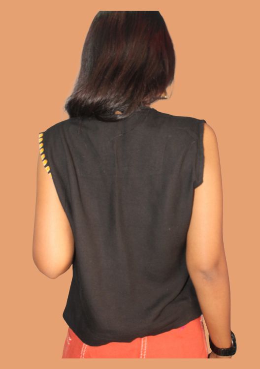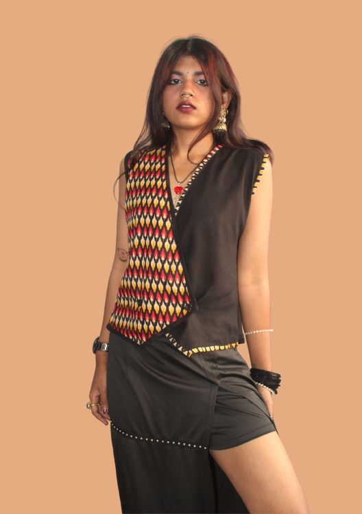 This striking wrap vest brings together the bold geometry of ikat with contemporary structure. Crafted from soft cotton, the vest features a deep black base with a contrasting multicolor ikat panel, piped with yellow thread.The asymmetrical cut adds a flattering edge, making it perfect for styling with skirts, trousers, or layered over dresses.